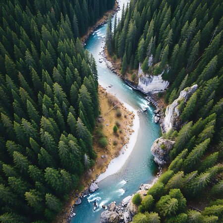 An aerial perspective reveals a dark, winding river carving its path through a dense, vibrant green forest. Tall evergreen trees, likely pines or firs, form a thick canopy on either side of the river, their branches reaching towards the sky. The water appears clear and reflects the surrounding greenery, with visible ripples and occasional rocks breaking the surface. A narrow dirt path is visible along one bank. The scene evokes a sense of untouched wilderness and tranquil natural beauty,...