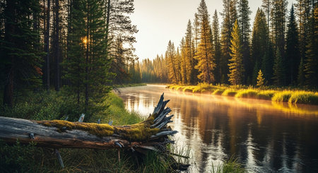 A tranquil river meanders through a misty pine forest, creating a serene atmosphere filled with soft light and lush greenery, perfect for nature lovers.