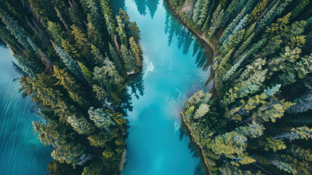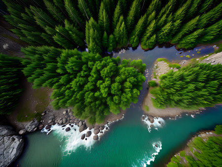 River viewed from above surrounded by coniferous trees captured in a vivid Kodachrome color palette depicted through a drawing. Generative AI Generated