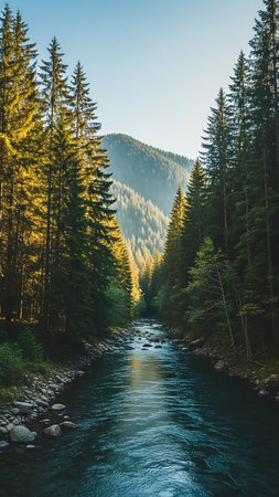 A serene mountain river flows through a dense evergreen forest, with sunlight illuminating the trees and distant misty peaks under a clear sky.