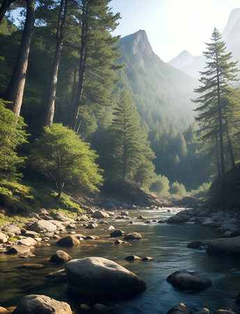 Serene showing a picturesque mountain stream flows through a dense evergreen forest with moss-covered rocks and a snow-capped peak in the background under a bright...
