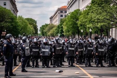 An AI-generated illustration of a group of police officers wearing protective respirator masks gathered in front of a large explosion.