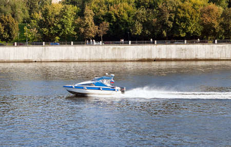 London, UK - 25 July, 2018: Metropolitan Police Boat sails London Thames at hight speed.