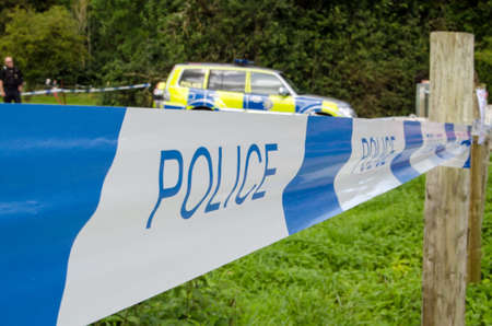 Plastic tape marked Police blocking pedestrians from crossing into a protected space with out of focus police officer and police car in the background.