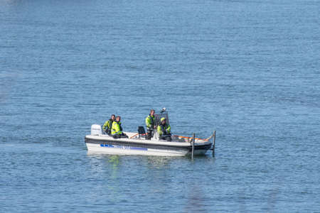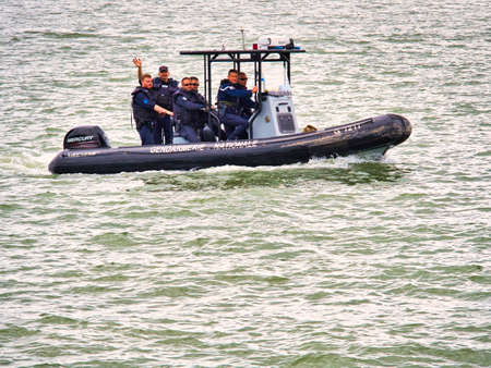YAINVILLE, FRANCE - JULY Circa, 2019. Rescue team on dinghy on the Seine river afor Armada exhibition securtity
