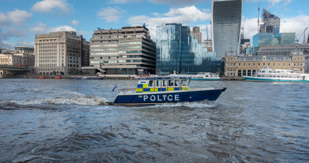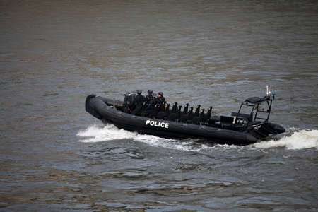 London, UK - April 13, 2019: Metropolitan Police Marine Policing Unit (MPU) on the River Thames, London on the background. MPU fleet is responsible for policing the River Thames within Greater London
