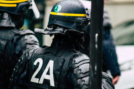 Paris France May 11, 2019 Portrait of a riot squad of the French National Police in intervention during protests of the Yellow Jackets against the policy of President Macron in Paris on saturday afternoon