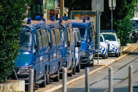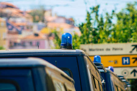 Lisbon Portugal july 24, 2020 View of a classic police car parked front the police station of Lisbon, the coastal capital city of Portugal and one of the stunning oldest cities in Europe