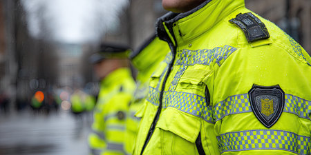Police officer in hi-visibility jacket policing crowd control at a UK event