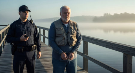 A man police officer stands guard over an arrested man in handcuffs on a misty wooden dock by a calm lake. Justice and law enforcement concept.