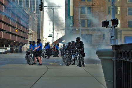 Dayton, Ohio United States 05/30/2020 police and SWAT officers through a cloud of tear gas at a black lives matter protest
