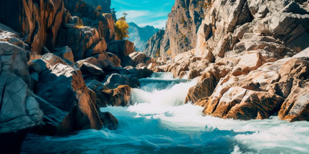 Stormy mountain river flows in the canyon. strong current. Splashes of water. stone shores. Sunny day. beautiful and colorful nature.
