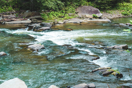 in summer forest on rugged rocks, foamy streams flowing mountain river