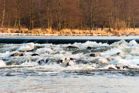 Rough river flow. The blue water of mountain river, the tide on sea with turquoise water and stone banks