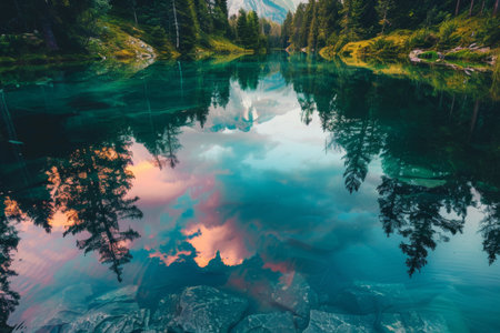 The tranquil lake mirrors surrounding mountains and lush forests, creating a perfect moment of serenity during the early morning hours. Nature invites calmness and reflection.
