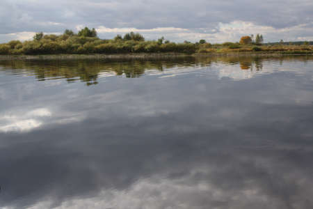 A river with autumn trees and beautiful clouds. Recreation. Travels. Fishing