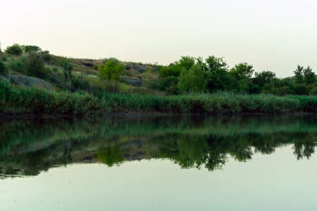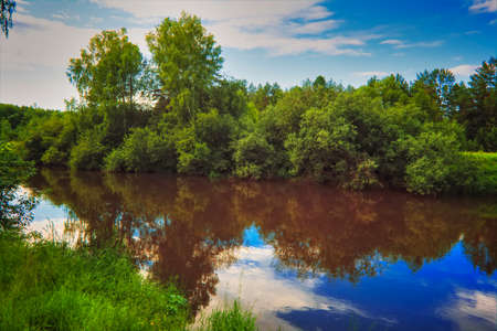 Summer landscape trees reflected in the mirror of the river lit by sunset rays of the sun