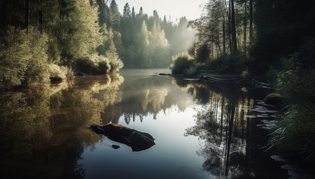 A Calm River Reflecting the Lush Green Forest and Morning Fog, a Serene and Peaceful Natural Landscape