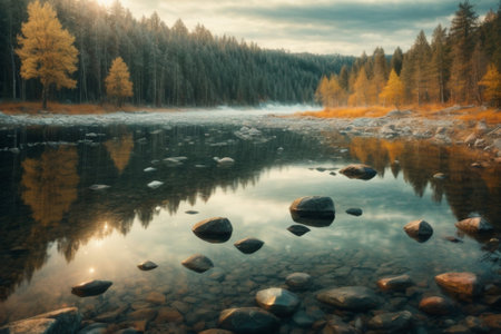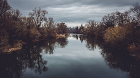 A picturesque river landscape featuring calm water reflecting surrounding trees under a dramatic cloudy sky, showcasing the beauty of autumn's serene ambiance.