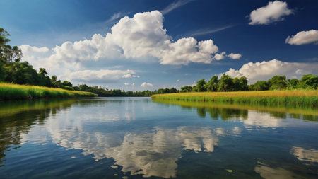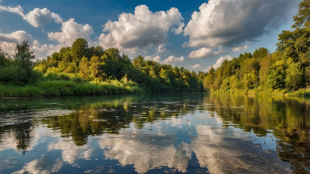 A serene river landscape showcases calm waters reflecting fluffy clouds and autumn trees. This tranquil scene captures the beauty of nature and invites relaxation.