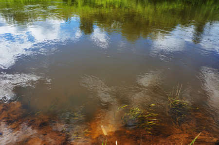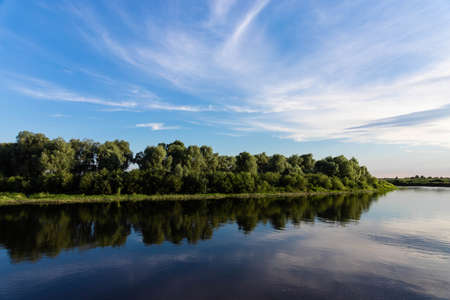 Beautiful summer landscape with river and clouds reflected in water, panorama
