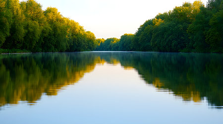 A tranquil river scene at sunrise, showcasing misty reflections and silhouetted trees. This peaceful setting captures the beauty of nature and serenity.
