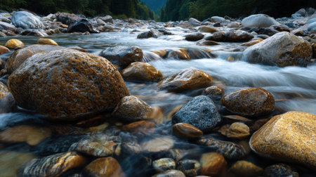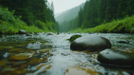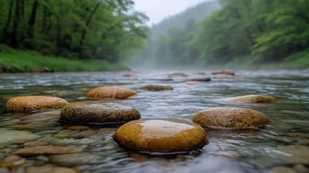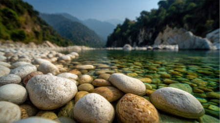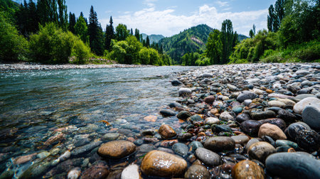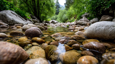 Serene river scene featuring smooth pebbles submerged in clear water, surrounded by lush greenery and trees. tranquil atmosphere invites relaxation and reflection