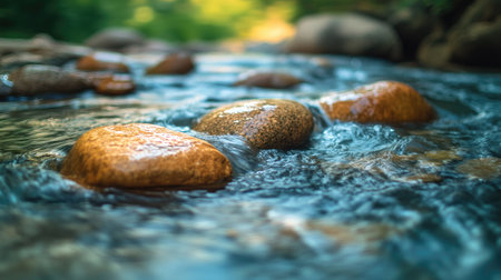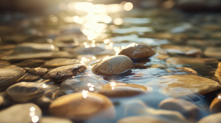 A serene scene of water flowing gently over smooth stones, capturing the beauty of nature with light reflections and a calming atmosphere, ideal for relaxation.