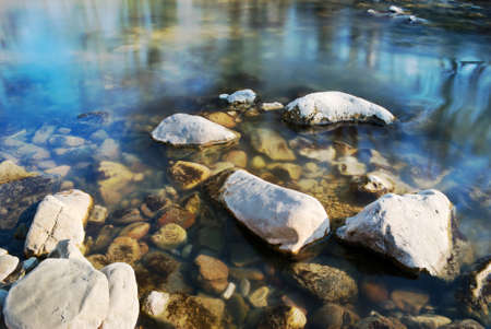 Irregular stones in the shallow water of riverside with sky reflection