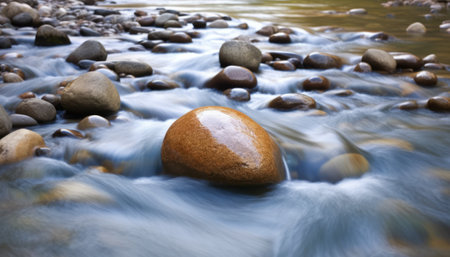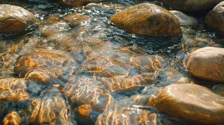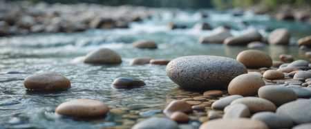 A close-up of stones in a river, with clear water flowing gently over them, creating a peaceful and natural outdoor scene