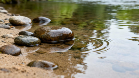 A peaceful riverscape showcasing smooth stones along the water