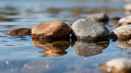A serene scene featuring smooth stones partially submerged in clear water, creating a tranquil atmosphere perfect for nature lovers and relaxation.
