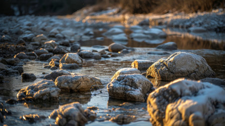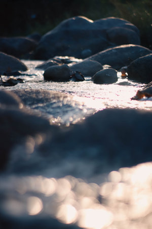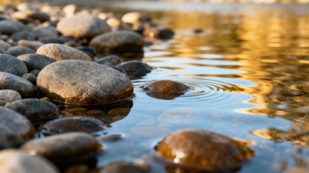 Rounded grey and brown stones resting along the riverbank edge, featuring a precise focus on water ripples reflecting warm golden light contrasted against the cool clear blue water surrounding the...