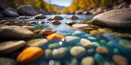 shallow river with smooth, round stones, created with generative ai