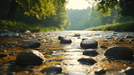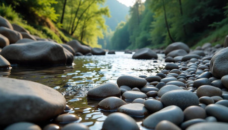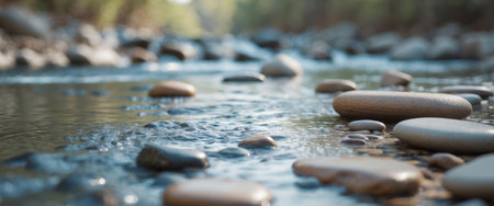 A serene view of a peaceful stream featuring smooth river rocks, surrounded by nature. The scene captures the tranquil flow of water under soft sunlight.