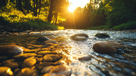 Gentle river meanders through a lush valley, glistening stones lining its banks. Sunlight sparkles on the water as vibrant greenery frames the serene landscape.
