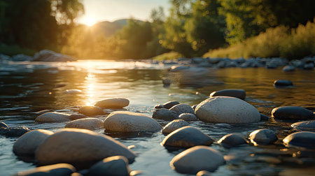 A tranquil river scene at sunset, featuring smooth stones and gentle water reflections. This serene landscape evokes feelings of peace and natural beauty.