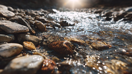 A crystal-clear stream gracefully flows over smooth stones, reflecting sunlight and creating serene ripples. Perfect for nature enthusiasts and landscape lovers.