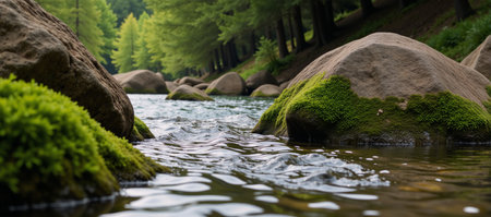 A tranquil forest stream flows through a picturesque landscape filled with lush trees and large rocks, creating a serene environment for nature lovers.