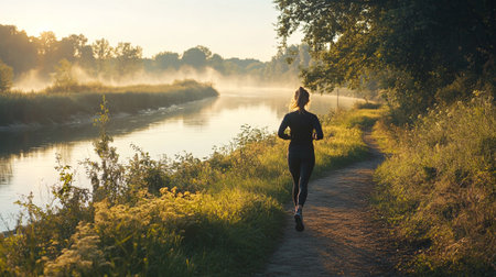 Young woman jogging along a river at sunrise. Healthy lifestyle.
