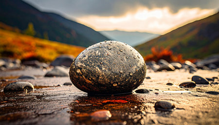 As the sun rises, painting the horizon gold, a serene riverbank awakens Tranquil waters reflect the sky's soft glow, inviting peace and mindfulness Pebbles line the shore, whispering tales of fresh starts and hope This picturesque landscape inspires a sense of calm, a beautiful reminder of nature's serene beauty AI Generative