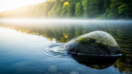 A balanced arrangement of stones is the central subject of this photograph, resting in water. The scene features a tranquil body of water, with surrounding trees and a blurred background. The composition uses muted colors, suggesting a calm atmosphere. The image could be used for wellness, meditation, or environmental themes in various media.