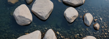 A serene view of smooth stones in a peaceful river, reflecting soft sunlight. This calm setting captures the beauty of nature in a tranquil environment.