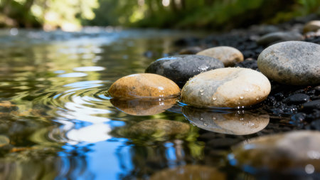 A peaceful river scene showcasing smooth stones by the water's edge, reflecting sunlight. This tranquil setting invites contemplation and connection with nature.