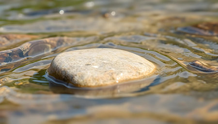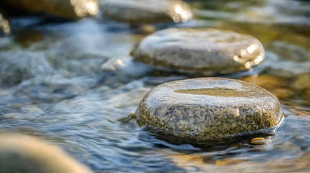 Close-up of rounded stones partially submerged in calm water, reflecting a soft, warm light. The image displays a natural, serene environment with blurred reflections. It presents a tranquil setting likely outdoors during daylight, suitable for various editorial and commercial applications. The composition emphasizes texture and natural beauty.