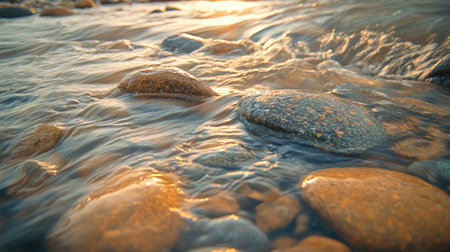 A serene view of smooth stones submerged in a gentle river, capturing the warm glow of sunset and the tranquil movement of water. Perfect for nature-themed projects.