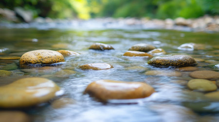 A peaceful stream winds through a bed of smooth, rounded stones, creating a serene atmosphere. Sunlight glimmers off the water, capturing the beauty of nature's untouched landscape.