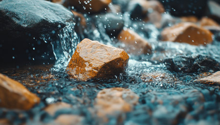 Imagine a mountain stream, alive with the rush of crystal-clear spring meltwater Smooth rocks glisten beneath the cascading flow, their surfaces polished by centuries of water The air is crisp and cool, and the vibrant green of surrounding foliage enhances the breathtaking beauty of this natural wonder AI Generative