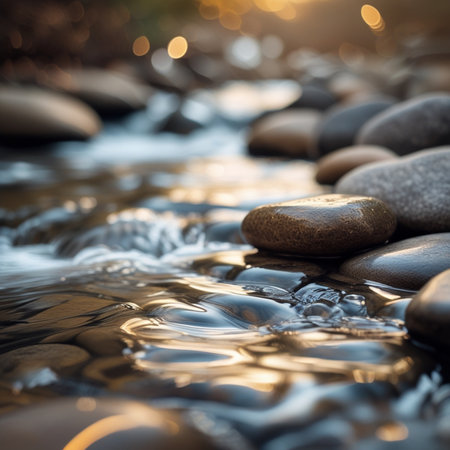 This image showcases a collection of smooth, rounded stones partially submerged in water. The scene is illuminated by warm sunlight, creating reflections and highlighting textures. The composition offers a close-up perspective, suggesting a natural environment. It could be used for various purposes, including website backgrounds or editorial content.