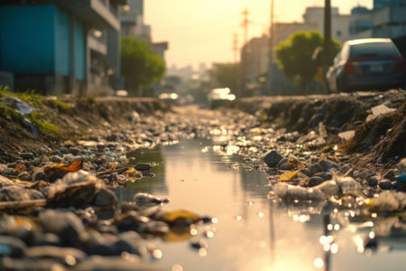 abstract shot of overflowing gutter reflecting surrounding nature, created with generative ai